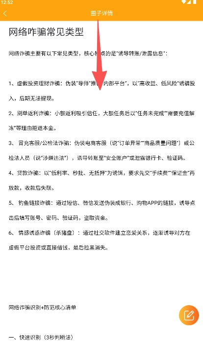 2、进入“圈子”页面点击左侧“谨防网络诈骗”分类查看防骗知识。