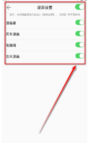 3、有多种漫画源可以选择,点击后方的按钮即可开启或关闭漫画源