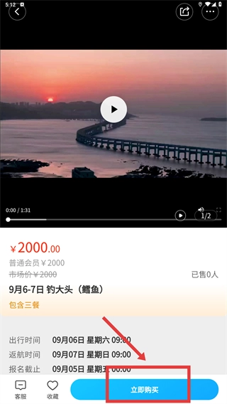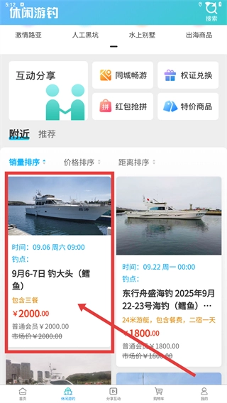 2、在列表页,通过排序方式(销量、价格、距离)筛选目标游钓项目,选择具体项目(如“9月6-7日钓大头(鳕鱼)”)进入详情页。