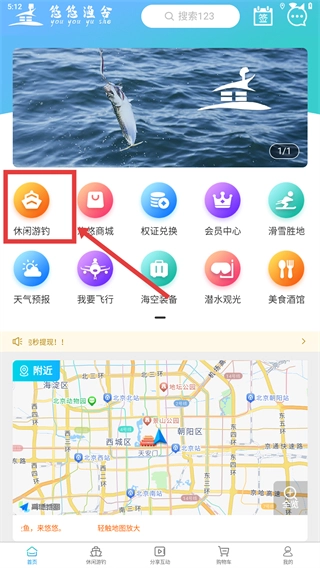 1、在首页找到【休闲游钓】的功能入口并点击,即可进入游钓服务列表页面。
