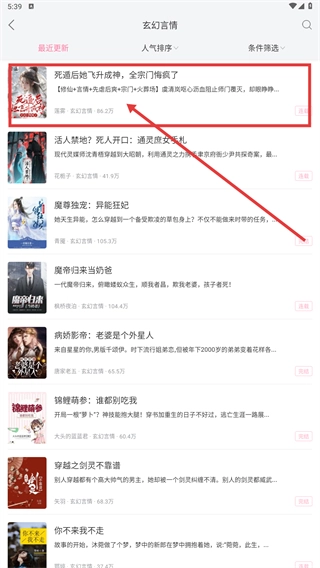 2、在分类页选择小说(如《死后通关飞升成神,全部门阀疯了》),进入作品详情页。