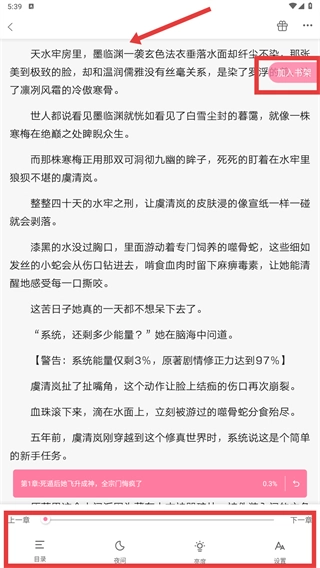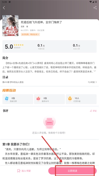 3、在详情页点击【加入书架】,可收藏作品;点击【立即阅读】,进入小说阅读界面。