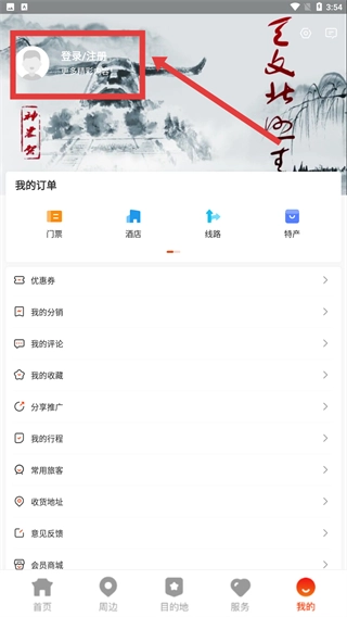 2、在“我的”页面,点击【登录/注册-区域】,进入账号登录页面。