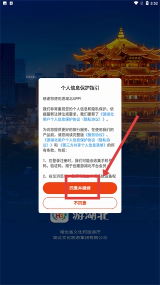 1、阅读个人信息保护指引后,点击【同意并继续】按钮,进入应用。