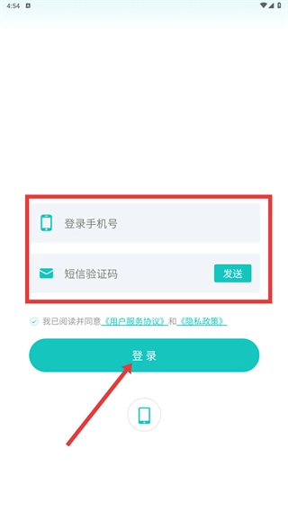 2、在登录页,输入登录手机号,点击【发送】获取短信验证码并填写,点击【登录-按钮】完成账号登录。