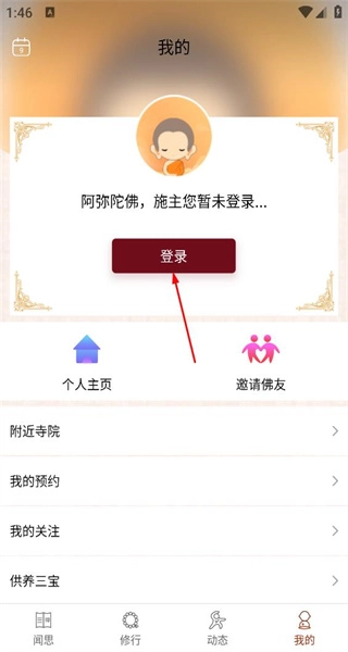 2、进入我的页面,看到暂未登录的提示内容,点击登录按钮,进入观禅实修对应的登录页面。