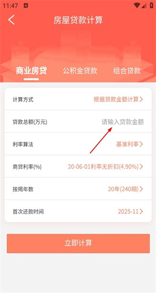 4、进入房屋贷款计算页面,选择商业房贷类型,输入贷款总额等信息,填好后点击立即计算按钮。