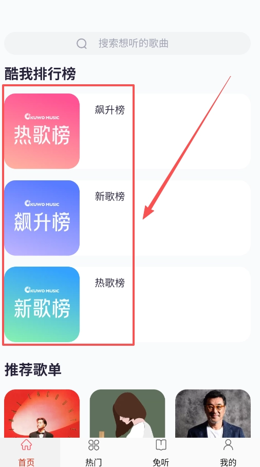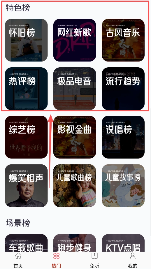1、打开酷我音乐后,先在底部导航栏点击“首页”选项,进入首页界面后,就可以看到特色榜、怀旧榜、网红新歌等各类榜单分类。