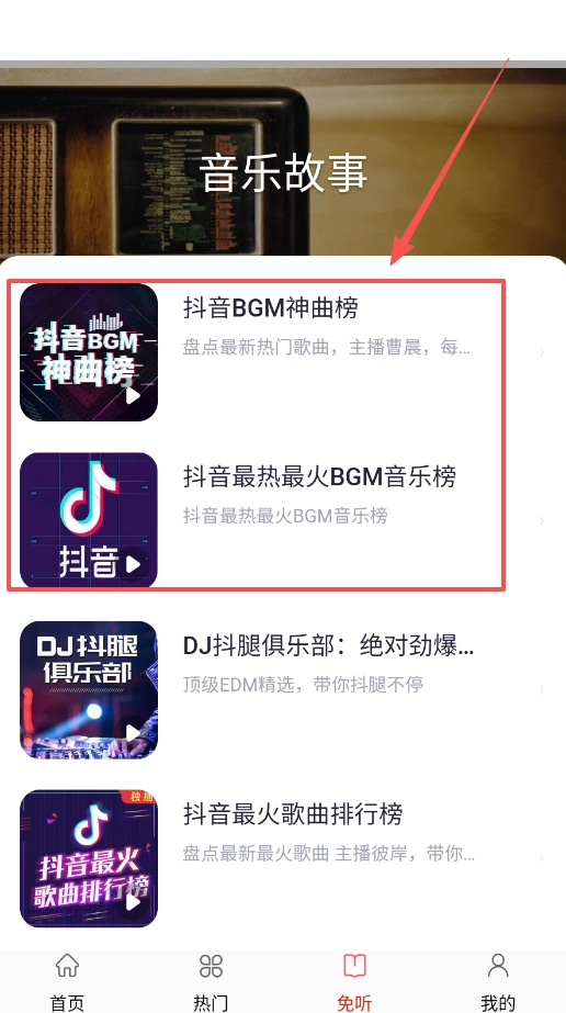 3、在热门板块里,你会发现很多推荐歌单,比如抖音BGM神曲榜、抖音DJ抖腿俱乐部。