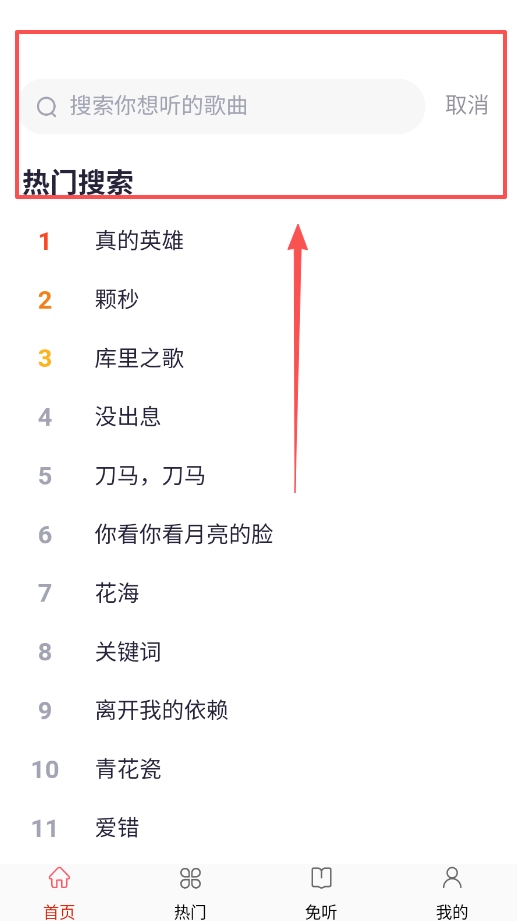 2、想找特定歌曲的话,点一下顶部的搜索框,输入歌名或歌手,或者直接查看热门搜索列表。
