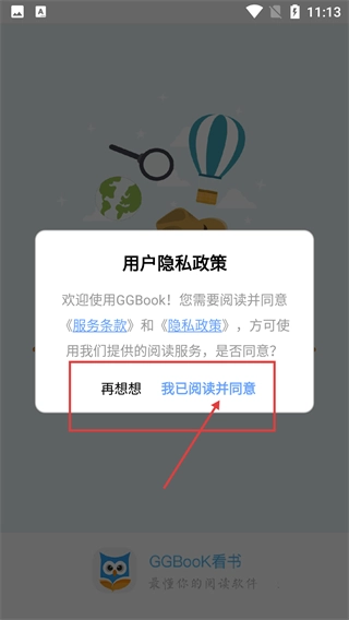 进入应用时会弹出《服务条款》和《隐私政策》的确认弹窗,点击【我已阅读并同意】按钮后,就能进入应用的阅读偏好选择页面。