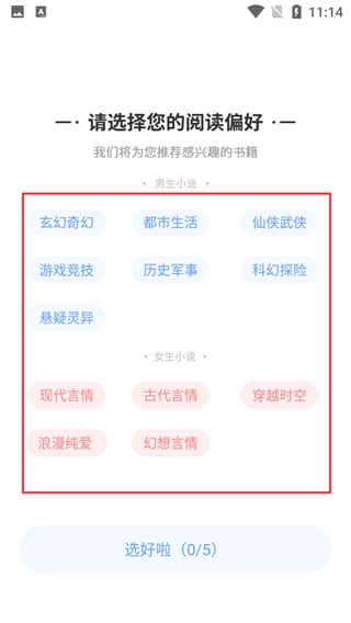 3、需选择至少5个阅读偏好标签,选满后【选好啦】按钮会变为可点击状态,点击即可完成偏好设置,进入应用主界面。
