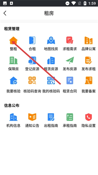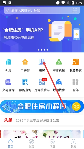 1、在【合肥住房-手机】首页,点击功能栏里的【租房】选项,进入租房模块页面,以便开展房源相关的操作流程。