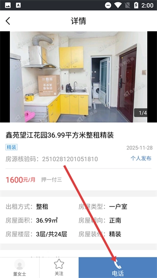 4、在房源详情页面,点击底部的【电话】按钮,联系该房源出租方,开展租房相关的咨询沟通事宜。