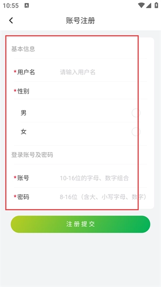 3、在账号注册页面,按要求填写【用户名】-选择【性别】-设置符合规则的【账号】与【密码】。