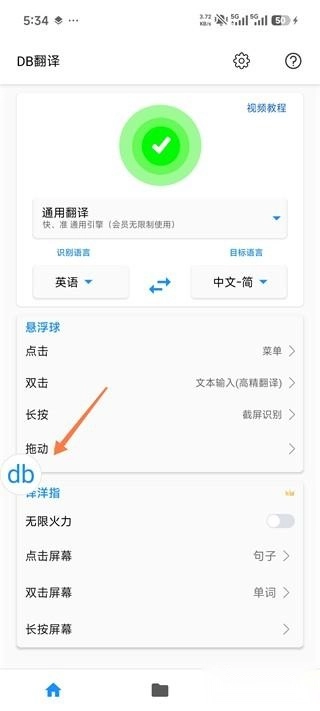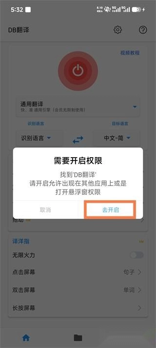 1、打开DB翻译App,点击界面中间的开启按钮,之后系统会提示我们进行权限开启操作