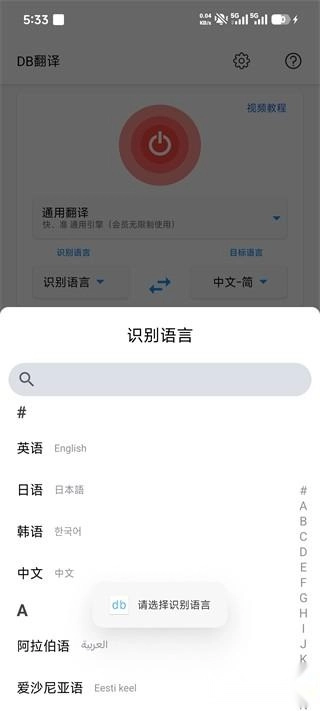 3、回到DB翻译App后,选择识别的语言