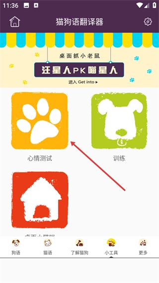 2、在小工具页面,点击【心情测试】功能入口,可进入宠物心情模拟测试的操作页面。