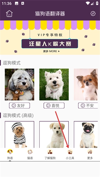 1、打开“猫狗语翻译器”应用并进入狗语页面后,点击底部的【小工具】选项,就能进入宠物互动工具的集合页面。