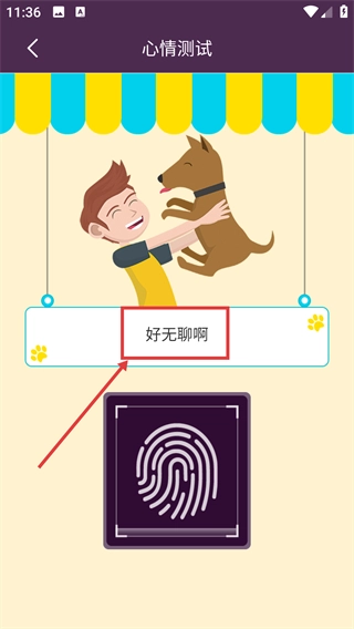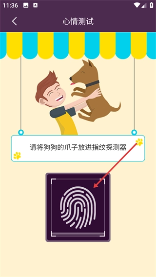 3、在心情测试页面,按提示将狗狗爪子放置于【指纹探测器】区域,触发心情检测流程。