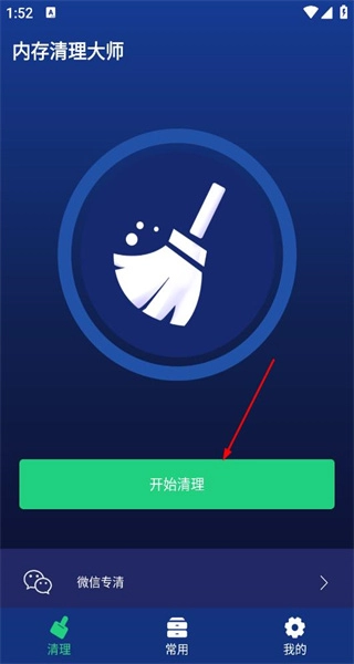 1、启动内存清理大师应用,进入其清理界面,浏览功能图标后,点击“开始清理”按钮,随即进入垃圾检测页面。
