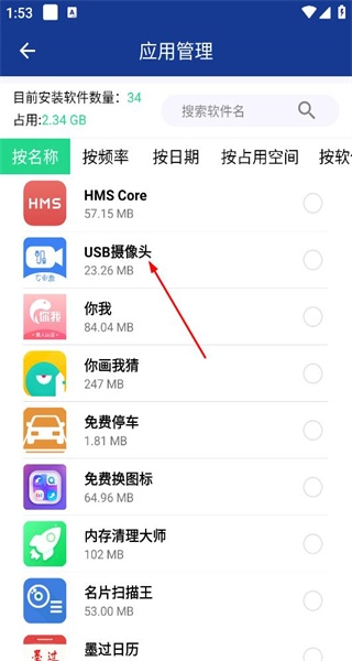 4、进入应用管理页面,查看已安装软件列表,浏览各软件的名称及占用空间信息。