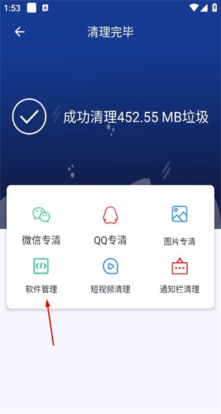 3、清理完毕后查看成功清理提示,选择软件管理选项,进入应用管理的操作页面。