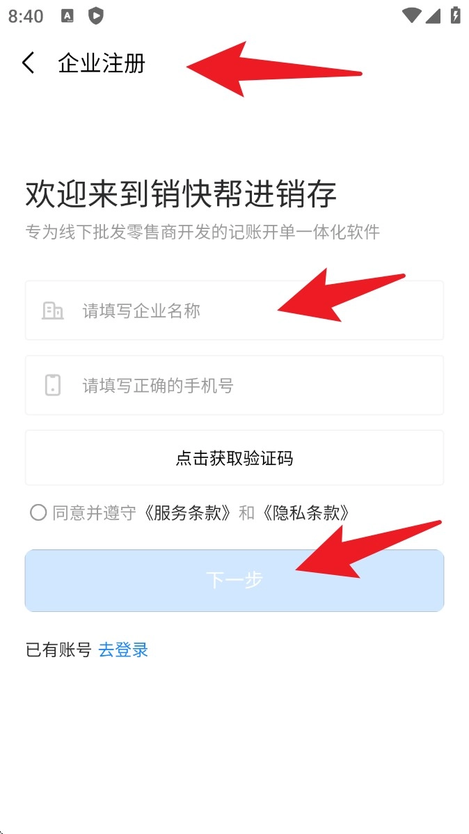 1. 进入App后,找到并点击“企业注册”选项;接着填写企业名称和手机号,获取验证码并勾选同意相关协议,最后点击“下一步”即可完成注册流程。