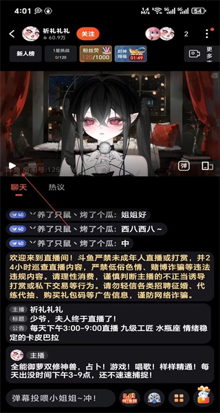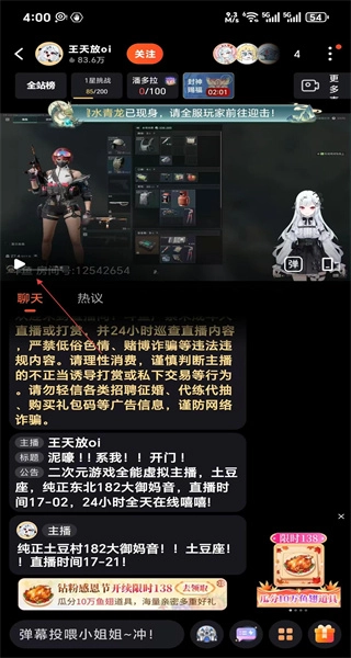2、进入某虚拟主播的直播间,可观看直播内容,在聊天区互动,还能查看主播的直播公告和相关介绍。