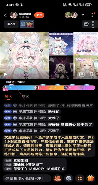 4、进入新的虚拟主播直播间,可查看主播的直播时间,在聊天区和主播及其他用户互动交流。