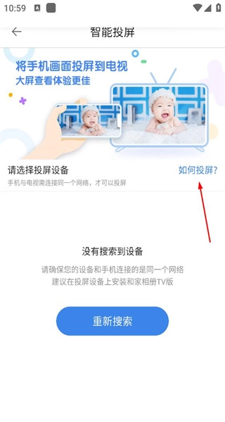 3、进入智能投屏页面,提示投屏到电视,显示未搜索到设备,选择如何投屏查看操作步骤。