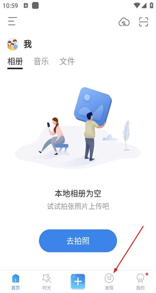 1、启动软件后,相册界面显示本地无内容,系统提示可尝试拍摄照片,并设有拍照按钮,点击“发现”即可进入对应的页面。