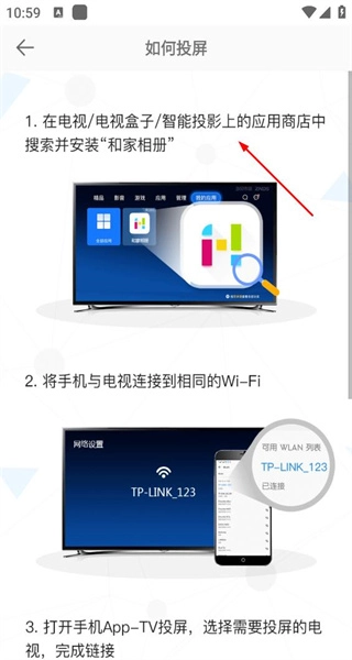 4、进入如何投屏页面,呈现三步投屏指引,含安装应用连接网络等内容,指导完成投屏操作。