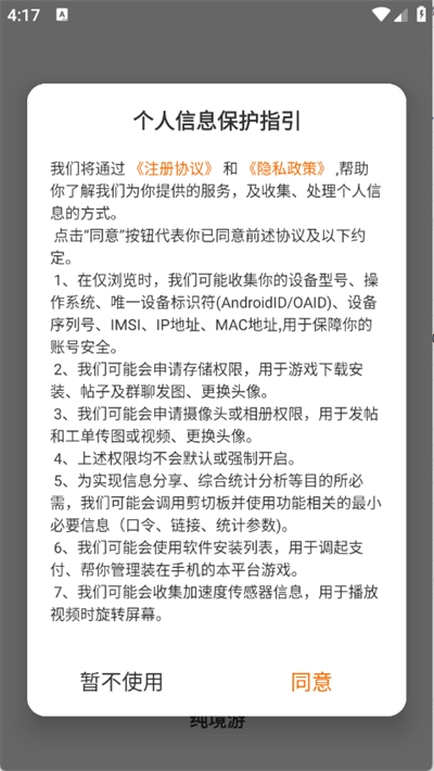 1、首先进入纯境游,查看并同意隐私政策和用户协议;