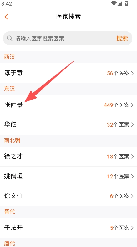 1、进入医案数据库,点击“按医家搜索”选项,可选择张仲景等特定医家进行检索。