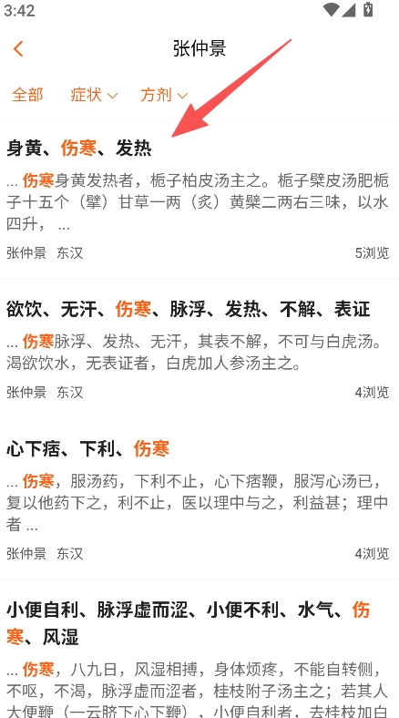 2、具备医家医案分类查看功能,按症状、方剂整理医案,如张仲景医案分不同症状组,助力深入学习医家诊疗思路。