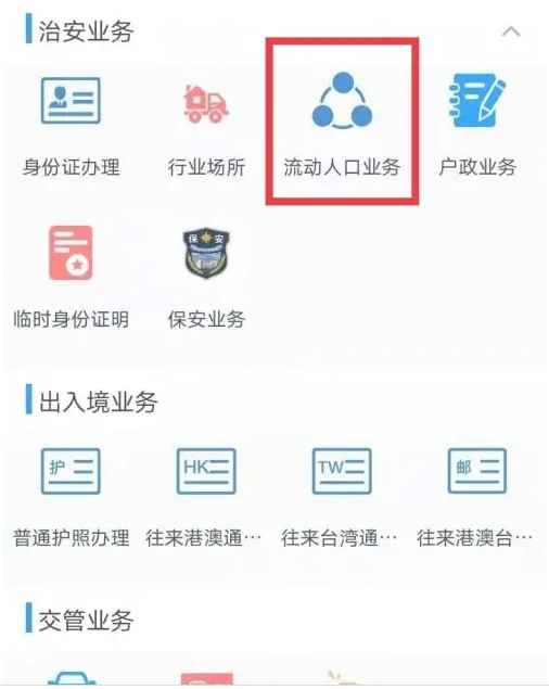 1、在新疆公安首页找到并点击流动人口业务板块。