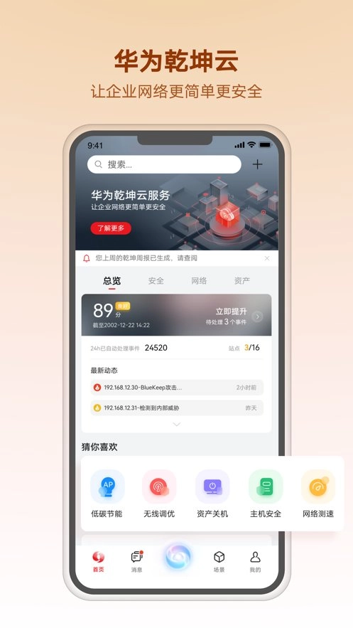 1)华为乾坤一站式安全&网络云服务,提高安全事件响应速度,全方位监测业务网络状态,优化业务运维模式;