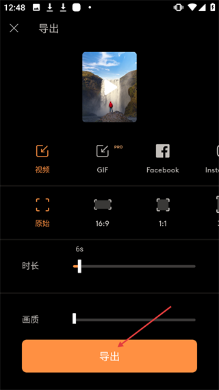 3、在导出设置界面,选择导出格式、尺寸等参数后,点击橙色【导出】按钮,可完成作品导出。