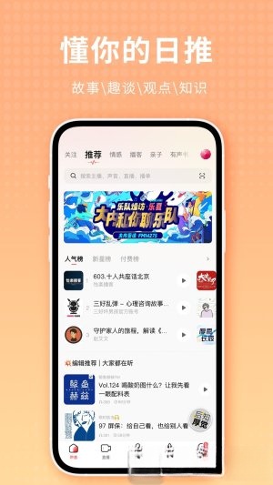2. 许多歌手、演员、故事主播以及知识类博主都在荔枝FM上开设了电台,听众能够收听到风格各异的声音内容。用户可以在这同一个平台中获取到娱乐、知识、故事等多个维度的节目。