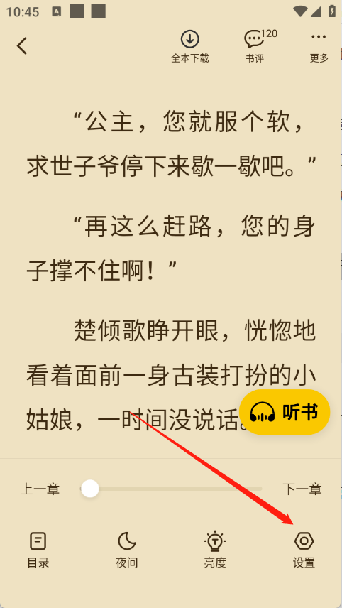 1、进入到小说阅读页面以后,点击“设置”。