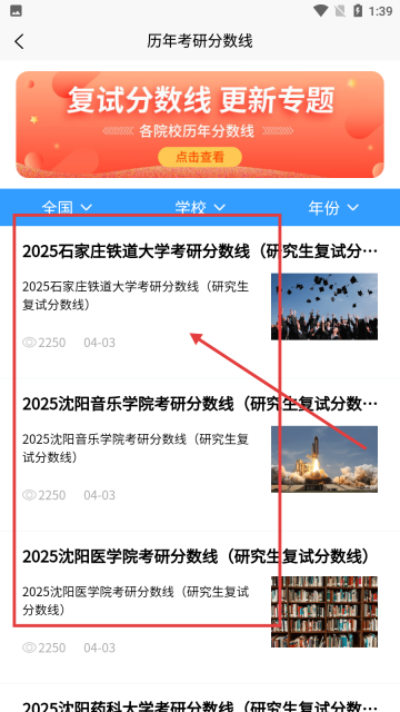 3、在历年考研分数线页面,选择院校和年份,查看目标院校的考研分数线信息。
