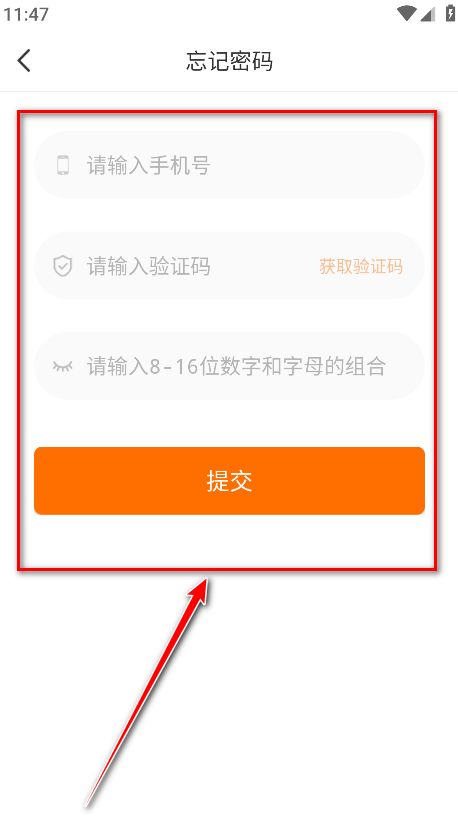 3.请输入手机号、验证码、新密码,点击提交即可。