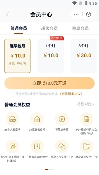 2、这里设有普通、超级、尊享三个级别的会员,月费分别为10元、20元、50元,大家可根据自身需求开通,每种会员的具体权益可在下方查看。