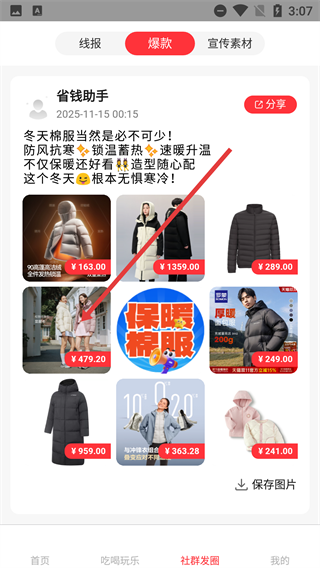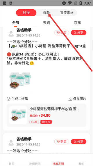 1、点击底部的【社群发圈】按钮,进入对应的社群发圈页面后,就能看到线报、爆款、宣传素材等不同板块的内容。