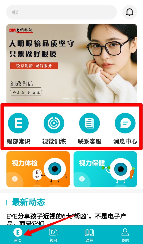 进入首页后,眼部常识、视觉训练、联系客服等模块一目了然,能帮助您快速获取护眼相关的资讯与服务。