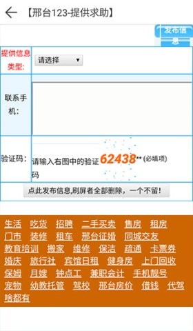 1、在邢台123App的首页,能看到多个服务分类板块,选择对应的分类点击进入即可。今天我们就拿“提供/求助”这个分类来举例说明。