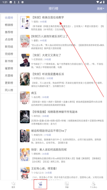 1、打开应用进入排行页面,点击感兴趣的小说,如【绝美白莲在线教学】,进入详情页。