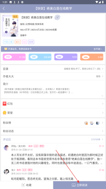 2、在小说详情页,点击【立即阅读】按钮,开始阅读小说内容。