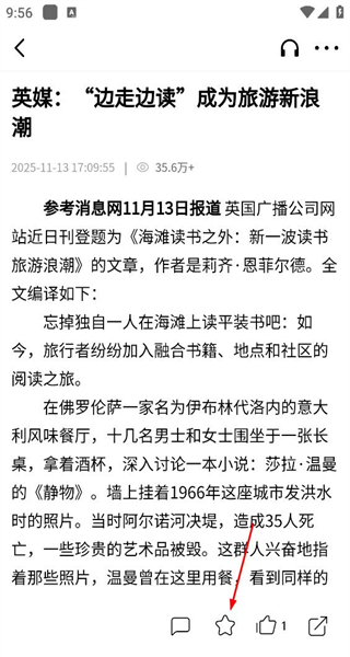 4、接着选择《边走边读成为旅游新浪潮》这篇文章,进入详情页阅读英媒的报道内容,也可以点击收藏按钮来完成收藏操作。